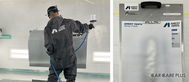 ブース内に用意された専用のチェックシートで、スプレーガンのパターン確認・調整も行われた