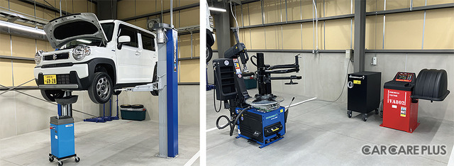 オイル交換やタイヤ交換、用品取り付けなどを行う「整備エリア」では、車重が重いEVにも対応するリフトをはじめ、タイヤチェンジャーやホイールバランサーを導入
