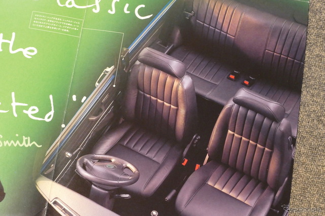 インテリアではボディ色のインパネやその上のステッチが施された本革のアッパーフェイシア本革のシート、ステアリング、ドアポケットを装備。3連のメーターはスミス製。グローブボックスは内部が使途レスグリーンに塗られ、リッド裏にはリミテッド・エディションのプレートが貼られていた。