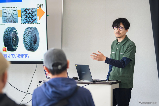 そして最後に登壇したのは、トーヨータイヤ・タイヤ技術本部の谷口二郎さん。オプカンの開発に携わる谷口さんからは、タイヤのトレッドデザインなど開発現場のリアルなエピソードが紹介された。R/TとR/Tトレイルのパターンデザインの違いについても詳しく解説された。