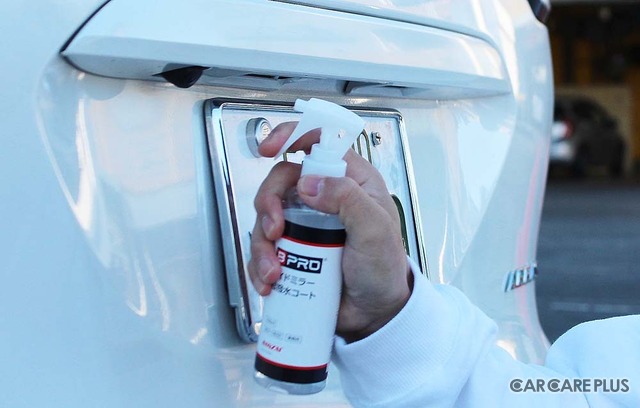 今回改めて、しのピー氏に『サイドミラー超撥水コート』を試してもらった。まず初めに、サイドミラーの汚れや油膜を専用クリーナーや洗剤でしっかり洗い落としてミラー面を洗浄・乾燥させたら『サイドミラー超撥水コート』をミラー面の上部からスプレーする(普通乗用車のドアミラー1枚に対して6から8回ほどスプレーするのが目安)。『サイドミラー超撥水コート』はバックカメラの汚れ防止アイテムとしても人気のため、今回はバックカメラにもスプレーした。