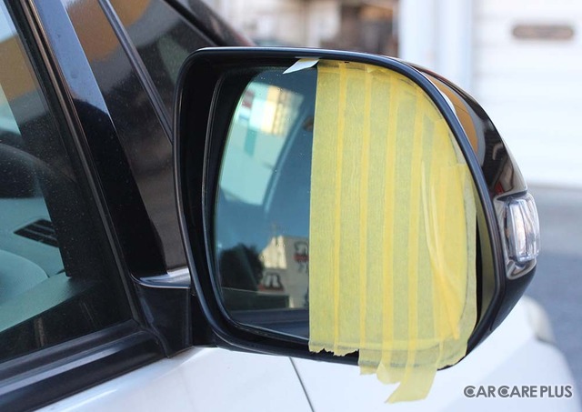 施工の効果がわかりやすいように、片方のサイドミラーの右半分に養生テープを貼り、施工と未施工の違いを検証。乾燥後に養生テープを剥がし、サイドミラーに水を吹きつけると『サイドミラー超撥水コート』を塗布した左側は圧倒的な撥水性を発揮して水を弾いたが、養生テープを貼っていた未施工のミラー面は水が流れ落ち、撥水性がないことがわかりやすかった。