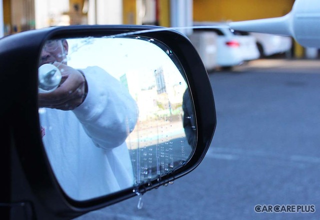 スプレー塗布すると、すぐに乾燥がはじまる。一時的に白い波のような形状が見えるのが『サイドミラー超撥水コート』の特徴で、乾燥すると透明に仕上がる。塗布したコート剤が乾燥(約1時間)するまでミラー面に触れないように要注意。水で濡れたり、指が触れてしまった時などは、ミラー全体をきれいに拭き取って、再度スプレー塗布する必要がある。