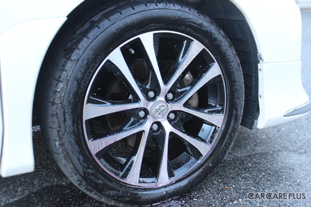 今回は、ホイールに『鉄粉除去剤』を塗布して効果のほどを検証した。まず初めに、ホイールに砂やホコリが付着していないか確認。付着していた時は水で洗い流す必要がある。目で見てわかるような砂やホコリがない状態で、ホイール全体をスプレーしていく。