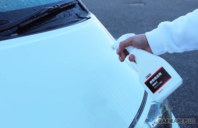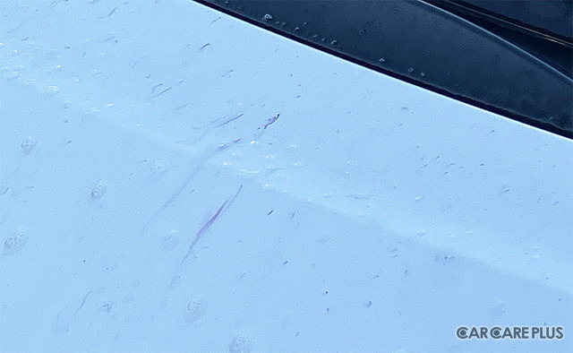 今回はボンネットでも『鉄粉除去剤』を試してみた。汚れが目立っていないボンネットにスプレー塗布し、2~3分ほど放置。見た目では鉄粉があるようには見えなかったのだが、部分的に紫色の反応が現れ、鉄粉が付着していたことがわかった。ホイールと同様、最後はボンネットに水をかけて『鉄粉除去剤』をすすぎ落とし、洗車ウエスなどで水分を拭き取れば終了だ。