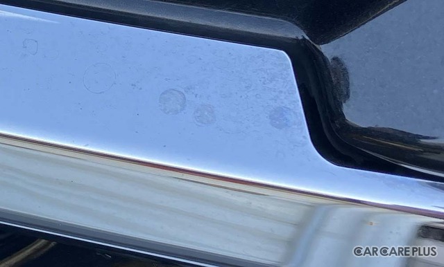 また今回は、水垢・ウロコ汚れ除去で定番人気のBPRO『スケールリムーバー』が、好評につき500mlに大増量(従来品は200ml)して2025年11月からリニューアル販売開始となったため当編集部スタッフが試してみることに。シルバー塗装のバンパーグリルにスポット的な水垢を発見。この水垢がしっかり除去できるのか? クロスに適量の『スケールリムーバー』を含ませて水垢部分に塗り込んでみると、すぐに水垢を除去できた。