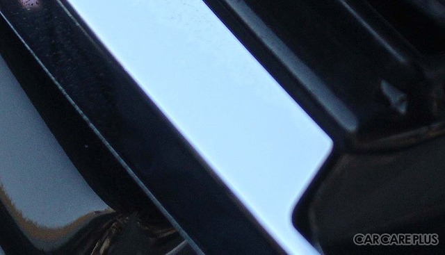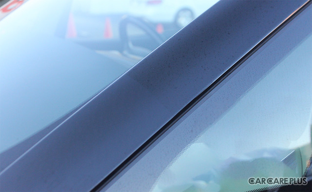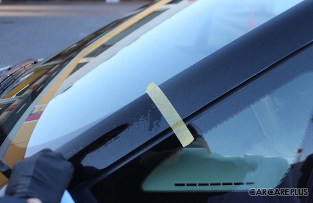 水ジミが目立つブラック調のAピラーにも施工してみる。施工の効果がわかりやすいように、養生テープを貼った状態で『スケールリムーバー』を適量含ませたクロスを使ってAピラーに塗り込む。あまり時間をおかず、養生テープを剥がして効果を確認すると、塗り込んだ部分は黒さが増し、塗り込んでいない養生テープの境目から先は白っぽく水ジミが付着しているのがわかる。水垢やウロコ汚れが除去され、艶やかなブラックが蘇った。
