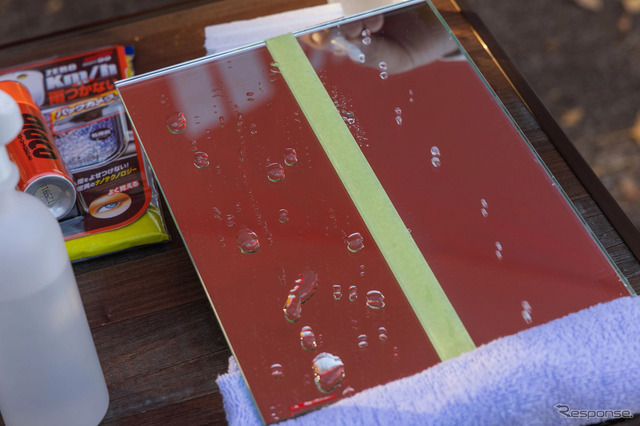 そして最後に用意されたのが「ガラコミラーコートZERO」。ミラーに吹きかけることで水滴が付着しなくなる撥水ケミカルなのだが、処理前/処理後を分割したデモ用のミラーに水滴を掛けると処理後の面は水滴が玉になってスルスル落ちていく様子が見られ、来場者からも「おー!」という歓声が上がるほどだった。