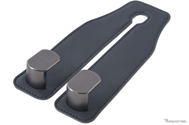最初に、「SEIWA(セイワ)」からリリースされているこちら、『レザー調ツインシートフック(WA161)』(価格:オープン、実勢価格:1280円前後)からお見せする。当品は、シートのヘッドレストシャフトに引っかけて使えるフックだ。これを用いればレジ袋やエコバックを簡単にかけられて、中の荷物が車内で散らばるのを防げる。
