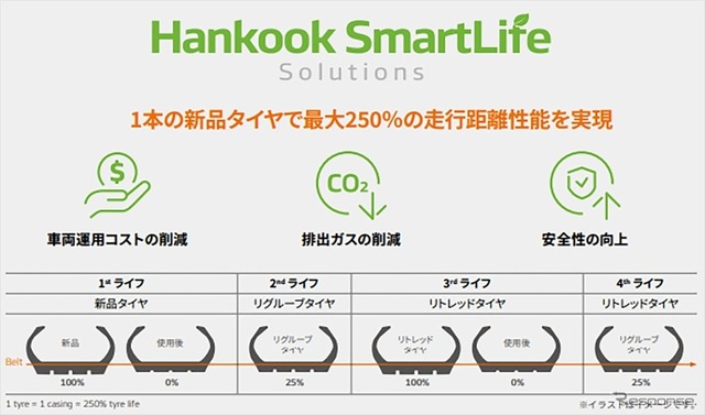 また、環境への配慮のため、ハンコック「SmartLifeソリューション」として、リグルーブおよびリトレッド可能な設計を採用し、タイヤの長期使用と再利用を促進することで、資源使用量の削減や環境負荷低減を実現する。