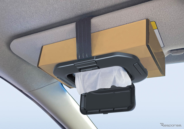 続いては、「EXEA(エクセア)」の『ティッシュホルダー(EE-44)』(価格:オープン、実勢価格:750円前後)をピックアップする。こちらは“ケース”ではなく“ホルダー”であることが特長だ。これを使えばサンバイザーがティッシュの指定席となる。またはヘッドレストシャフト部分へも取り付けられる。