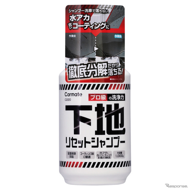 下地リセットシャンプー[C220]は、しつこい水アカ・古いコーティングを強力に分解する作用を持つ。3つの成分で古いコーティング、水アカ、虫汚れ、融雪剤、ピッチタール、鳥フンなどを徹底的に除去する。アルカリ性クリーナーが水アカや古いコーティングを強力に分解し、キレート剤で水アカなどの原因となる金属イオン(カルシウム、マグネシウムなど)を吸着、超微粒子パウダーで分解した汚れをしっかり除去する。コーティング前に使用することで、コーティング効果を引き出す。大容量1000グラム入りだ。