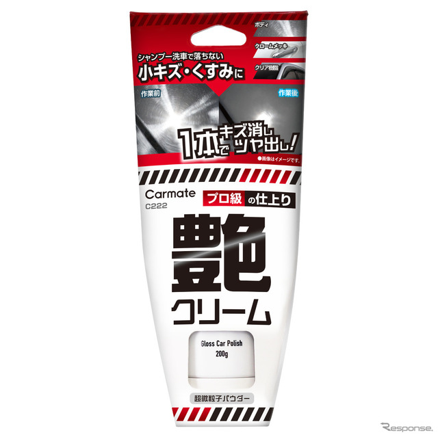 艶クリーム[C222]は、小キズをならし、艶を出す。超微粒子パウダーが、小キズやくすみ、ウォータースポット、水アカをしっかり除去する。艶を引き出す保護成分配合で深い仕上がりになる。塗装面(ボディ、バンパーなど)だけでなく、クロームメッキ(ドアノブ、グリル、ホイールなど)やクリア樹脂(ドアバイザー、ヘッドライトなど)にも使用可能だ。乾いた面・濡れた面どちらでも使用でき、1本で「キズ消し+ツヤ出し+保護」の3役を実現する。