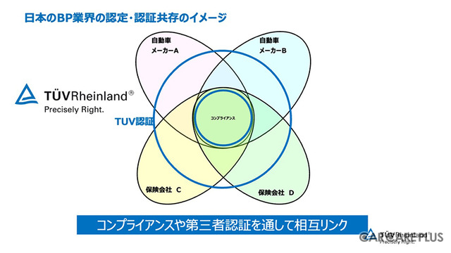 栗田氏が特に強調していたのは、各自動車メーカー独自の「認定(Accreditation)」と、テュフ ラインランド ジャパンが行う「認証(Certification)」の切り分けと共存の重要性である。メーカーが定める独自基準である認定に対し、認証は「公の基準」に基づくものと定義をし、各メーカーや保険会社のこだわりである認定のコア部分に、テュフ ラインランド ジャパンが提供する「工場運営に直接関わるコンプライアンス」を共通言語として据えることを提唱している。