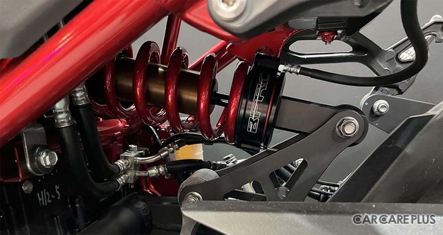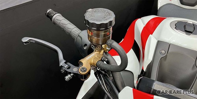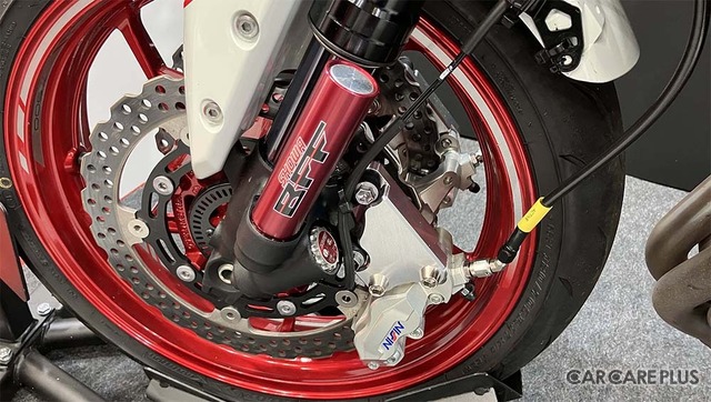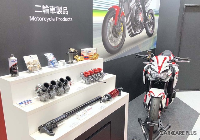 二輪車製品では、Astemoの二輪ブランドであるKEIHIN、SHOWA、NISSINといった世界的なブランドを統合した強みを生かした展示が行われた。各ブランドのキャブレターやキャリパー、サスペンションなどが展示され、各ブランドのカスタマイズパーツを取り付けてAstemoカラーにペイントしたデモ車両があり、存在感を放っていた。