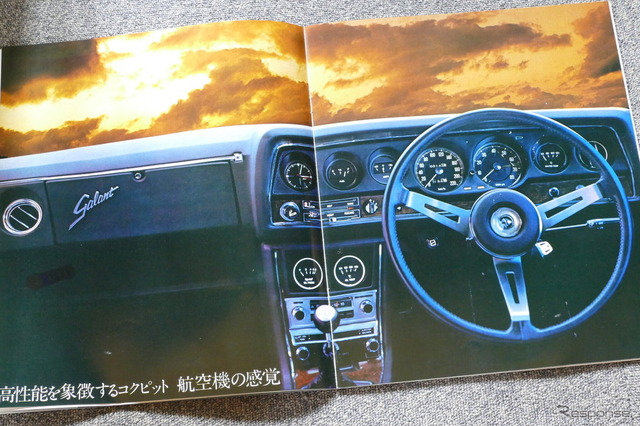 インストルメントパネルは、当時のスポーティモデルの文法に倣ったもので、ステアリングホイールはコーン型の3本スポーク、その向こうにドライバーに向けて角度を合わせたメーター類を配置。グローブボックスの大きめのgalantのオーナメントが当時のクルマらしい。シートはハイバック式が採用されている。