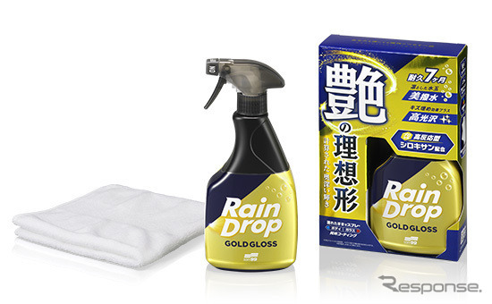 最高峰プレミアムモデルの「レインドロップ ゴールドグロス」は、内容量400mlで専用マイクロファイバークロスが付属する。新開発の「リアルタイムグロステクノロジー」により、艶と施工性という従来は両立が難しかった2つの性能を高次元で実現した。撥水効果はボディで約7か月、ガラスで約か月持続する。