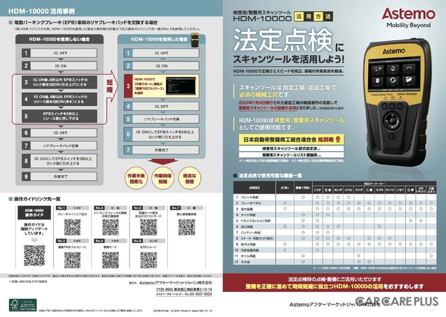 Astemoアフターマーケットジャパンは、今回の出展に合わせて『HDM-10000』の新リーフレットを制作。「法定点検にスキャンツールを活用しよう!」と強調されており、法定点検で使用可能な機能と対応カーメーカーが一目でわかる情報を記載。リーフレットを開くと整備記録簿点検項目ごとに、対応システムや機能名、『HDM-10000』で対応できる作業内容が具体的にわかりやすく記載されていた。