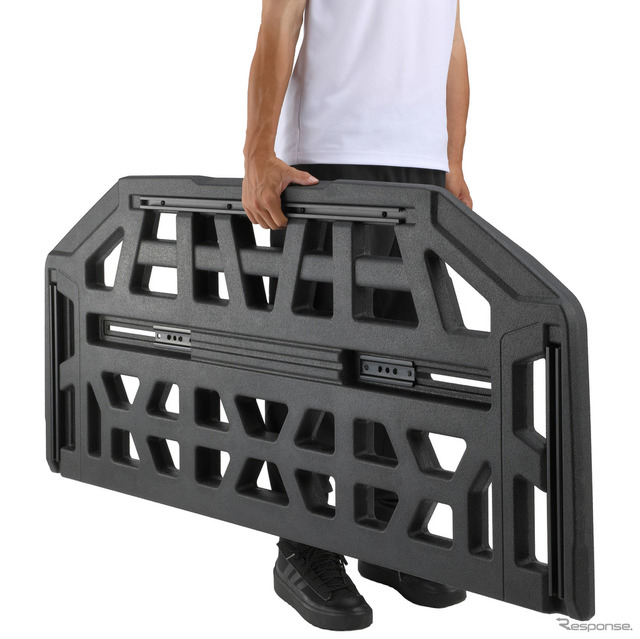 同製品は、ブロー成形による中空構造の樹脂ボードを採用し、従来の同サイズアルミ製ラックと比べて33%の軽量化を達成した。Sサイズ(110BK)は約10kg、Mサイズ(120BK)は約11kg、Lサイズ(130BK)は約12kgで、セパレート構造のため片側約5から6kgと、大人1人でも持ち運びが可能だ。素材にはHDPE(高密度ポリエチレン)を使用している。