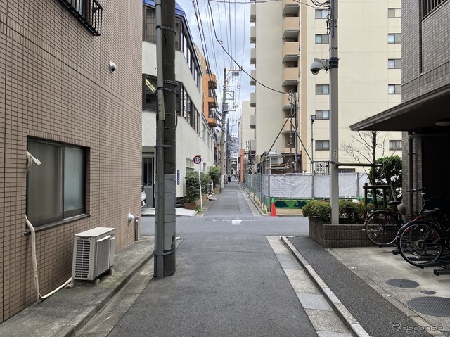 江東区の中西部は、震災や戦災の被害があったり、運河や貯木場を埋め立てたりで、町割りや車道が比較的整備されている。そういった車道に囲まれた一角に、こうした狭い生活道路が通っている。