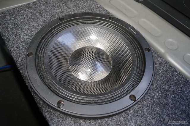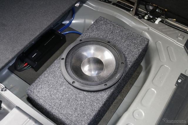 ラゲッジに収められたのはサブウーファーと、それをドライブするパワーアンプだ。フロントスピーカー関連の機器については、すべてコックピット側で完結させているのもこのクルマの注目点である。