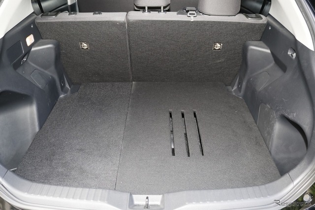 ラゲッジの作り込みにもオーナーのリクエストが込められている。ひとつは先に紹介したボードに設けられたスリットだ。ボードを設置した状態でも低音の抜けを考慮した作り込みになっている。またボードは左右2分割で脱着できる仕様としている。これはコンペ出場時などに右側のサブウーファー側ボードのみを取り外し、サウンド重視のアレンジを可能にするためだ。