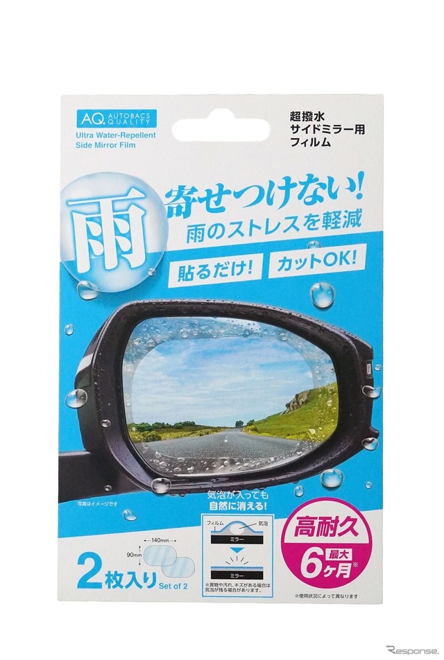 オートバックスセブンのプライベートブランド「AQ.」から、雨天時の運転の視界確保をサポートする「超撥水サイドミラー用フィルム」が新発売。価格は1980円(税込)。