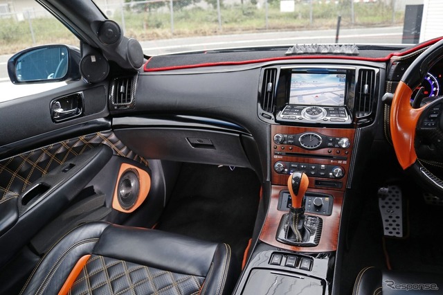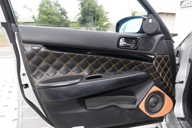 ドアにはオレンジステッチを使ったレザー処理が加えられるなど、内装カスタムを重視する小栗さんらしいクオリティの高いドアカスタムが施されているのも見どころだ。