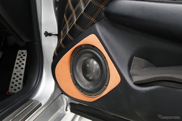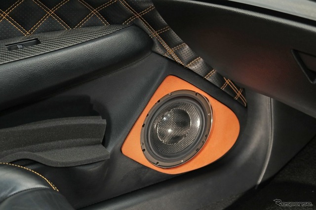 インストールも見どころ満点だ。ドアの純正位置周辺を大胆に加工し、アウターバッフルを作り込んでいる。バッフル面は広い平面を確保する独特の形状で、サウンド面でのメリットを考慮した構造となった。さらにデザイン面では、インテリア各部に使われているキーカラーのオレンジでフィニッシュ。アウターバッフル形状と、スプリーモMW6の艶やかなカーボン振動板とのコントラストも美しい。