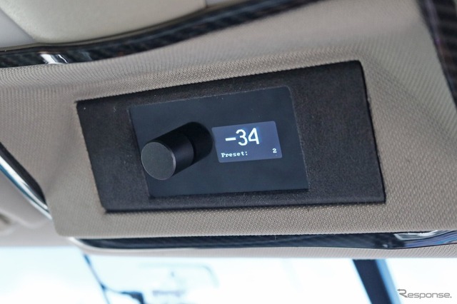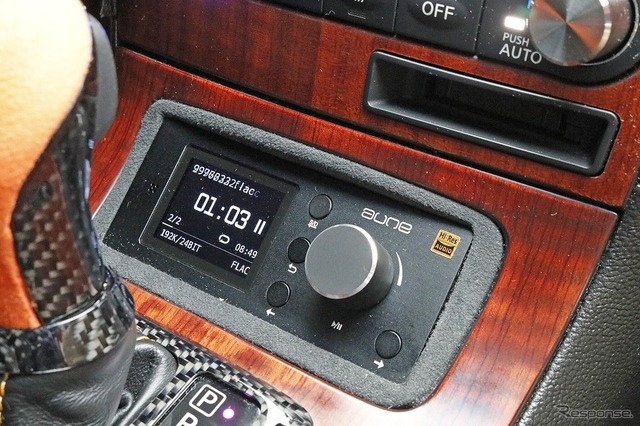 コクピットのインストールでは、操作部と表示部にもデザイン性と使い勝手を高める取り付けが施されている。センターコンソールにはアウネ(車載デジタルプレーヤー)のコントローラーをビルトイン。純正パネルを加工し、グリルをワンオフして埋め込んでいるため、純正インテリアとの一体感も高い。木目パネルに対してグレーの人工スエードを使ったグリル処理もよくなじんでいる。またオーバーヘッドにはリゾルト(DSP)の操作部を設置。こちらも周辺パネルをワンオフし、スマートに取り付けられている。インテリアに融合するデザインと生地選びも秀逸だ。