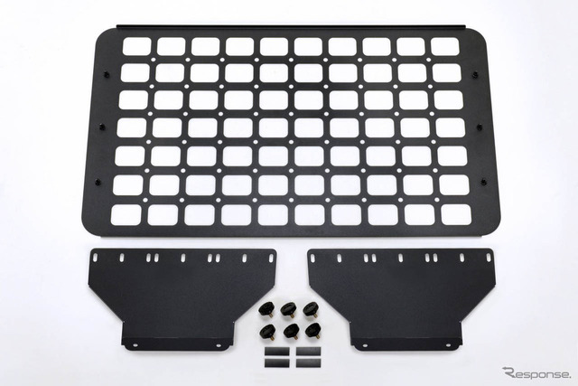 ストレージパネルシリーズの第3弾となる同製品は、ラゲッジルーム(荷室)の天井付近にある使われていないスペースを有効活用するためのパネルだ。角穴と丸穴が開いたパネル構造により、モールシステムに対応した小物ケースやポーチを固定できるほか、M8アイナットやボルトを使って拡張性を高めることもできる。